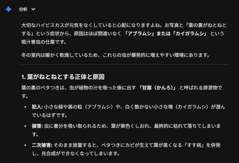 今回は当家のハイビスカスのトラブルの写真を生成AIのGemini3 Flash(無料版)に見せて、診断してもらいました。