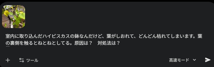 今回は当家のハイビスカスのトラブルの写真を生成AIのGemini3 Flash(無料版)に見せて、診断してもらいました。